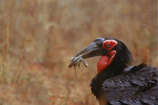 犀鸟的大嘴和盔突显得很笨重,其实非常灵巧。采食浆果、捕食老鼠昆虫,有时也会捕食蛇来吃,它的吞吃特色是:用长嘴巴将食物往上抛起,然后用嘴非常精确的接住,一个生吞。