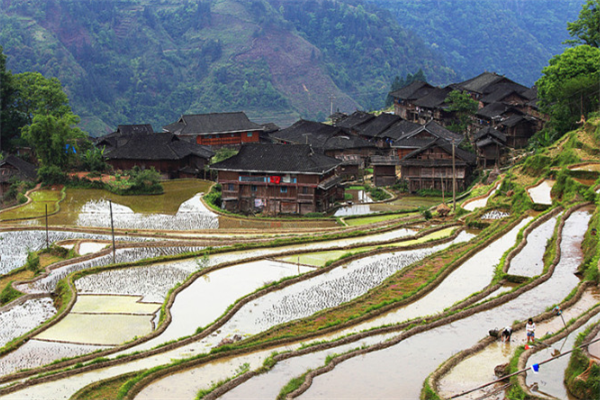 贵州苗寨梯田,位于贵州省雷山县丹江镇,由于这里特殊的地貌,所以这里的农户只能靠着山坡修梯田,上面的水缓缓地往下流,使得每一款田地都能被水灌溉,每一块庄稼都能茁壮成长。